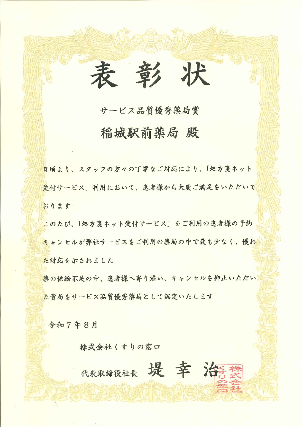処方箋のキャンセル率が低く、ご利用者からの評価が優れている薬局に贈られます。